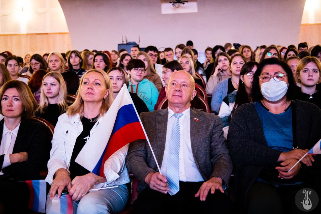 A solemn event dedicated to the annexation of the DPR, LPR, Kherson and Zaporozhye regions took place in the Concert Hall of Belgorod State University of Arts and Culture. From September 23rd to 27th, referendums on joining to the territory of Russia were held in these regions. The majority of residents yeasay. The students organized a concert to support the territories, which was attended by professors, university staff, students: the hall was crowded. Among the organizers were students from the attached regions. They told about their pain, expressed gratitude to the country for a difficult but important historical decision. The audience supported the guys with loud applause, exclamations, waving flags.